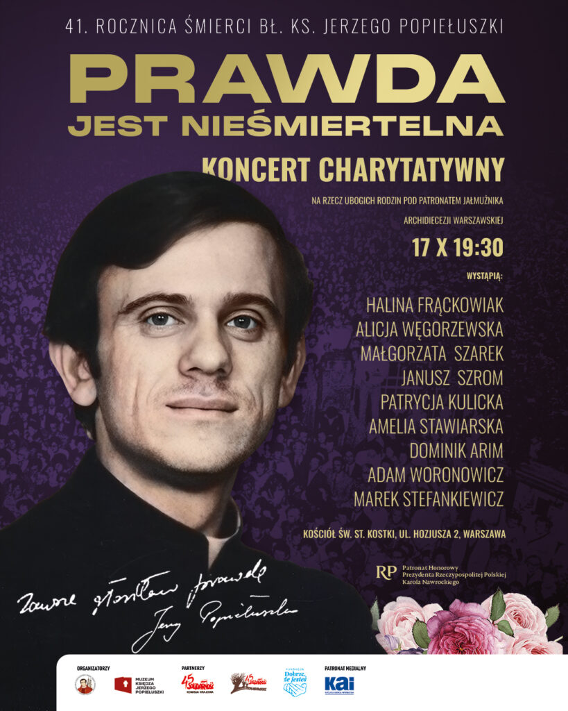 17 października o godzinie 19:30 w kościele Św. St. Kostki odbywa się koncert zatytułowany “Prawda jest nieśmiertelna”. W jego trakcie aktor Adam Woronowicz będzie prowadził dialog z księdzem Jerzym dotyczący aktualności jego nauczania o prawdzie. W koncercie udział weźmie plejada artystów kilku pokoleń: Halina Frąckowiak, Alicja Węgorzewska, Janusz Szrom, Małgorzata Szarek, Patrycja Kulicka, Amelia Stawiarska i Dominik Arim. Na fortepianie zagra Marek Stefankiewicz. Wstęp na koncert jest wolny. Wydarzenie objął patronatem Prezydent RP Karol Nawrocki.