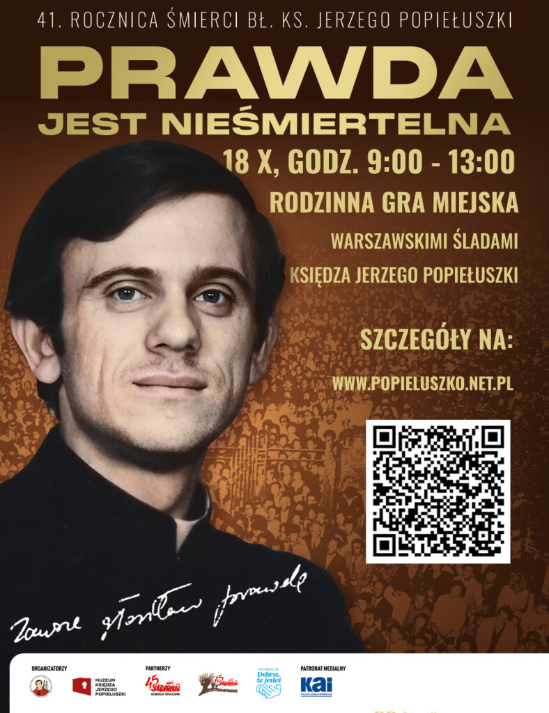 18 października zapraszamy udziału w Rodzinnej Grze Miejskiej warszawskimi śladami bł. ks. Jerzego Popiełuszki. Gra miejska rozpocznie się o godzinie 9:00 przy bramie Huty Warszawa przy ulicy Kasprowicza 132. Uczestnicy następnie pełniąc misję wspierającą działalność księdza Jerzego Popiełuszki przejdą szlakiem związanych z nim miejsc. Do wzięcia udziału w grze miejskiej zapraszamy rodziny, grupy parafialne, i inne. Osoby chcące wziąć udział w grze miejskiej prosimy o zapoznanie się z regulaminem oraz zarejestrowanie się na stronie: RODZINNA GRA MIEJSKA. Wydarzenie objął patronatem Prezydent RP Karol Nawrocki.